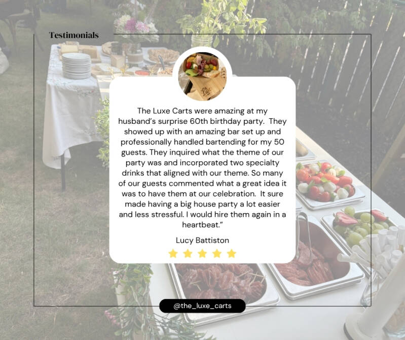 The Luxe Carts Catering is more than just a catering company — it's a labour of love built by a mother and daughter who share a deep passion for serving others through food. Based in Kitchener, Ontario, our journey started in our family kitchen, where laughter, love, and great meals brought everyone together. We’ve carried that same spirit into every event we cater, whether it’s an intimate backyard gathering or a grand celebration. With every cart, every dish, and every detail, our goal is simple: to make people feel cared for, celebrated, and full. Hospitality is in our hearts, and we’re honoured to share that with you.